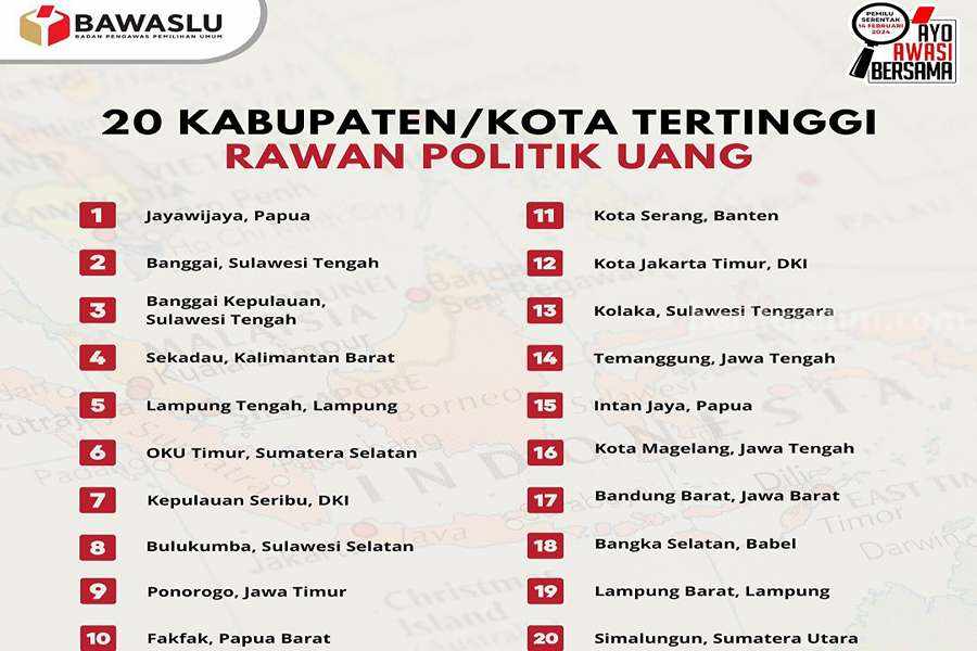 Bawaslu merilis temuan 20 kota/kabupaten di Indonesia yang dianggap memiliki tingkat kerawanan tertinggi terhadap praktik politik uang dalam Pemilu 2024.